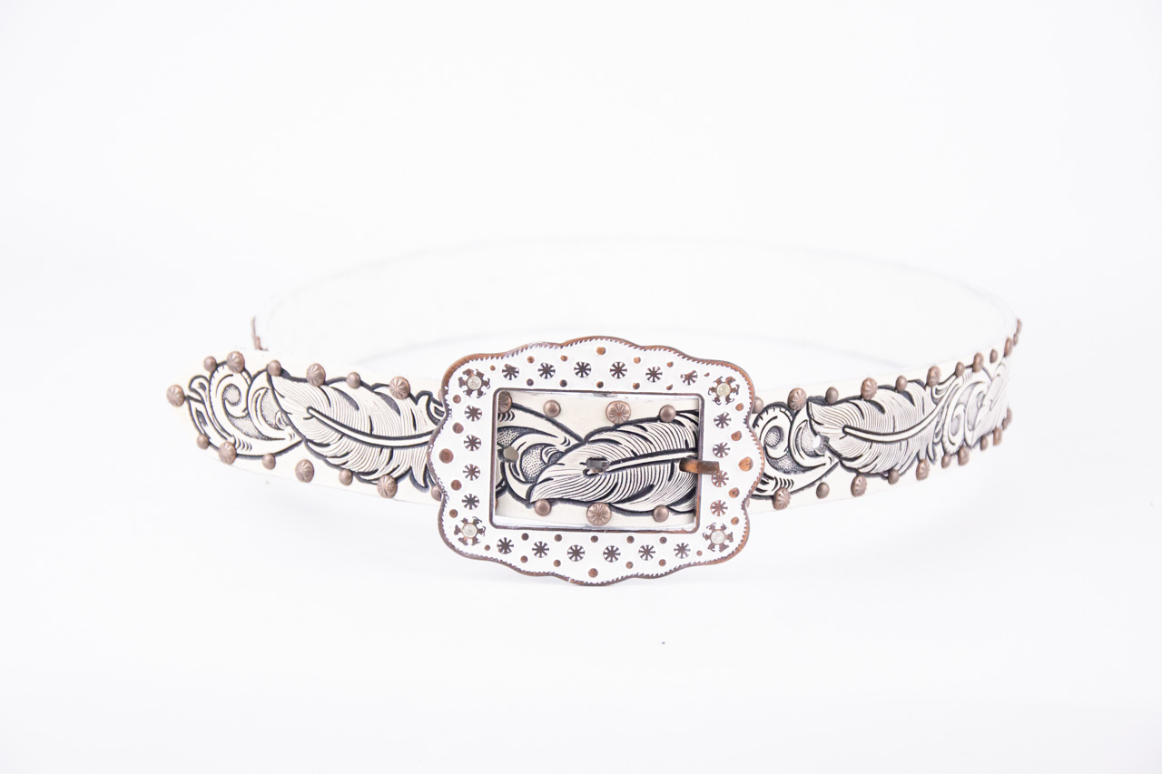 Fabricado em couro legítimo, 4,5cm de largura aprox, com detalhes em bordados (entalhados), charroas de material sintético e fivela de metal removível.