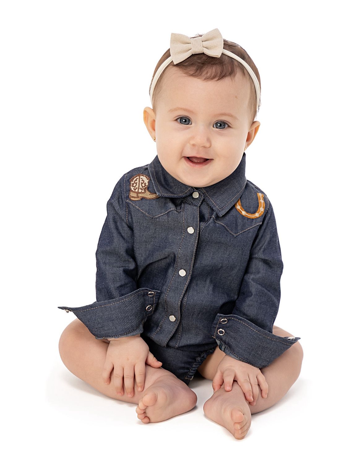 BODY BABY EM JEANS LEVE. BORDADO FRONTAL DA PALA