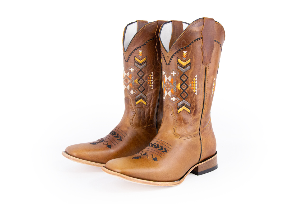 Pé fabricado em couro bovino legítimo de alta qualidade, bico quadrado, com florão bordado no peito do pé.