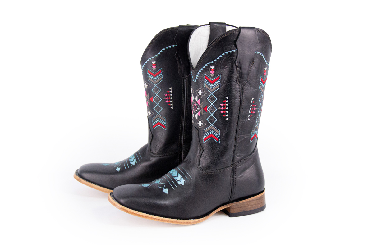 Pé fabricado em couro bovino legítimo de alta qualidade, bico quadrado, com florão bordado no peito do pé.