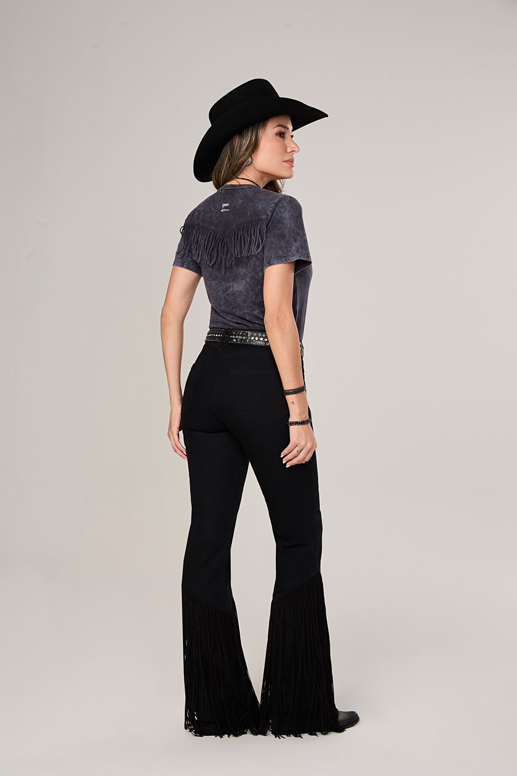 Com aplicação de franjas na cor preta do joelho da calça pra baixo até a barra.