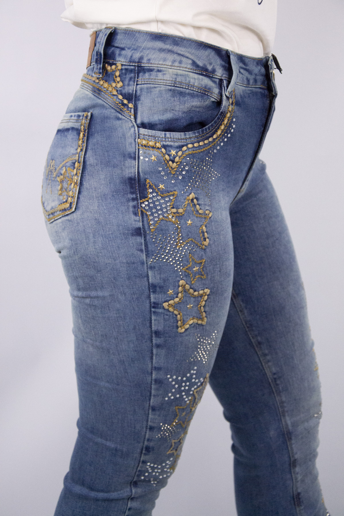 Com Bordados em strass na frente da calça e nos bolsos traseiros.
