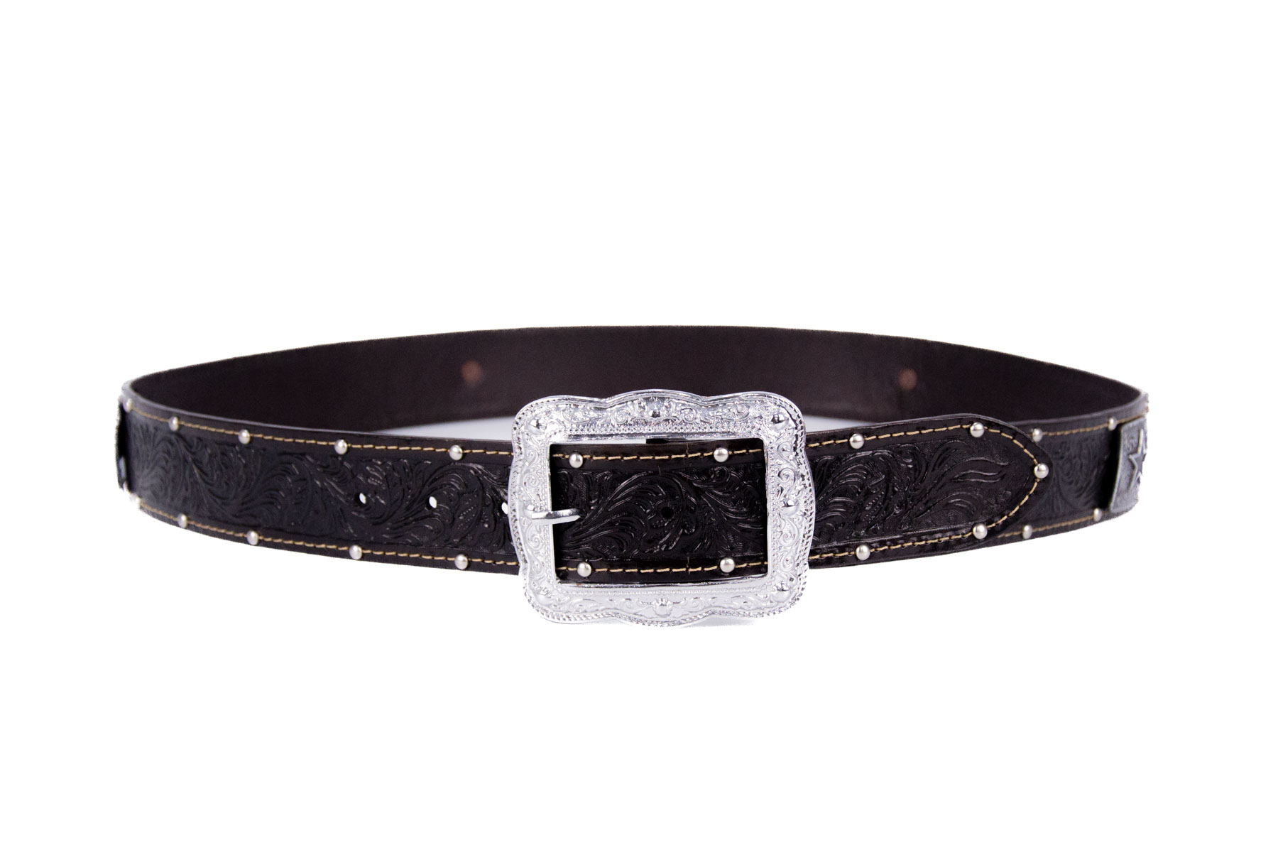 Fabricado em couro legítimo, 4,5cm de largura aprox, com detalhes em bordados (entalhados), charroas de material sintético e fivela de metal removível.