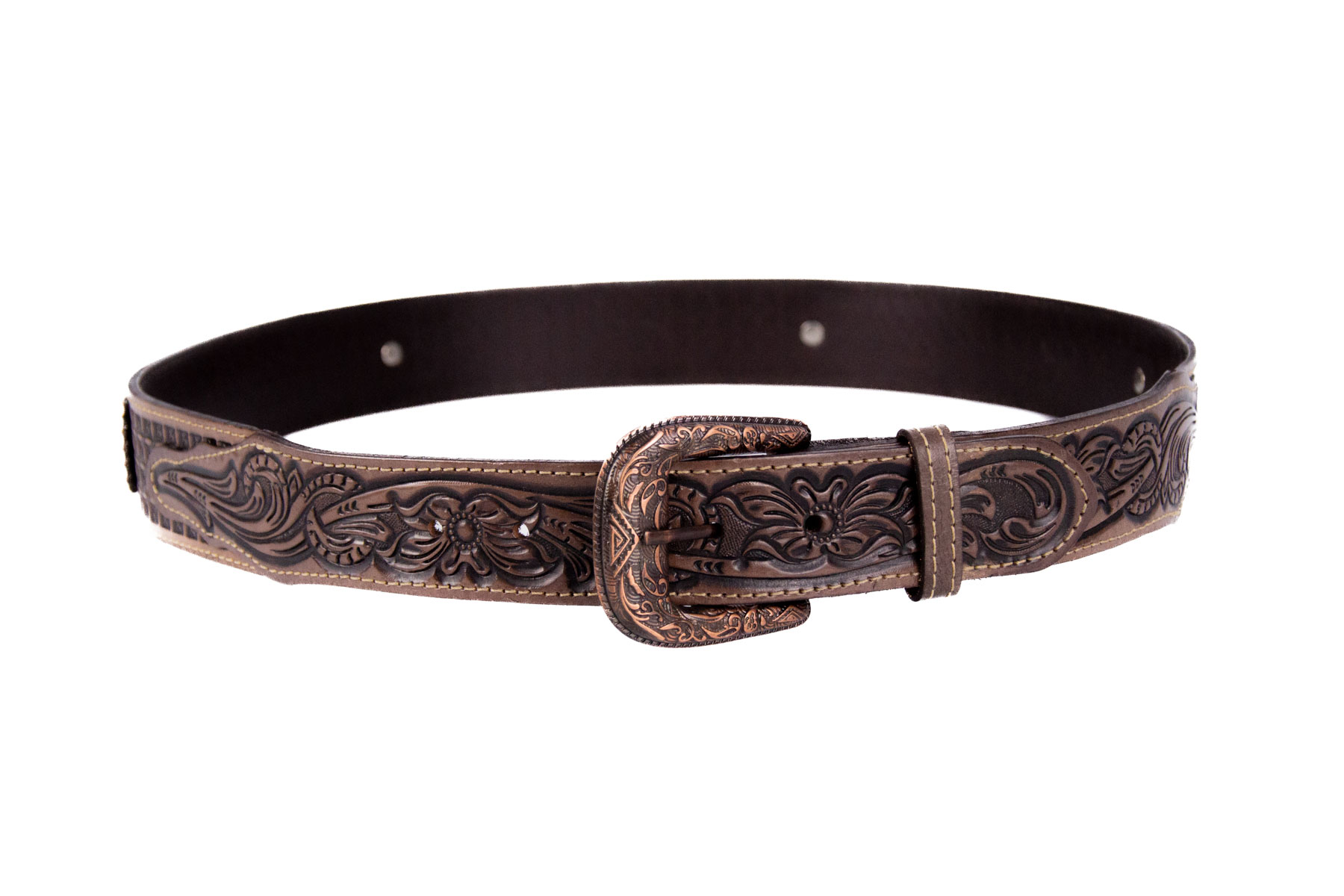 Fabricado em couro legítimo, 4,5cm de largura aprox, com detalhes em bordados (entalhados), charroas de material sintético e fivela de metal removível.