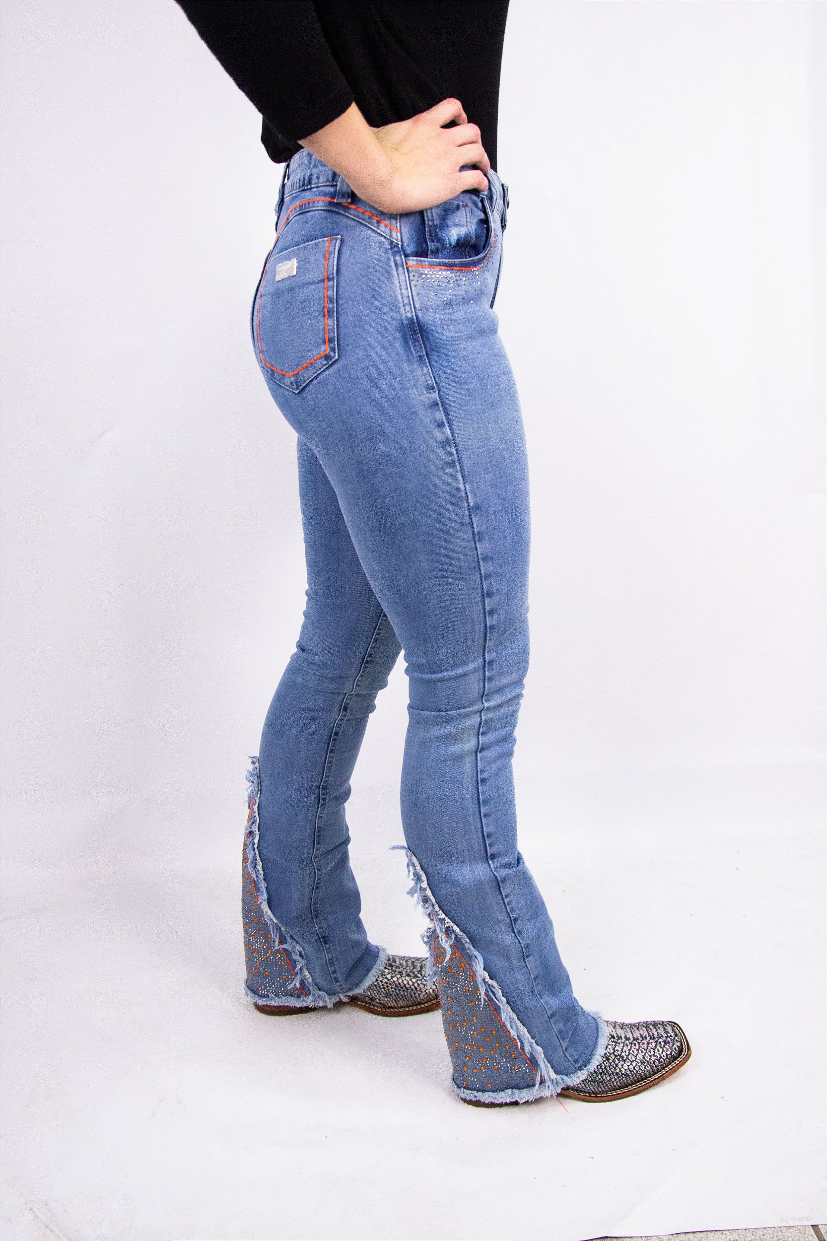 Com Bordados em strass na frente da calça e nos bolsos traseiros.
