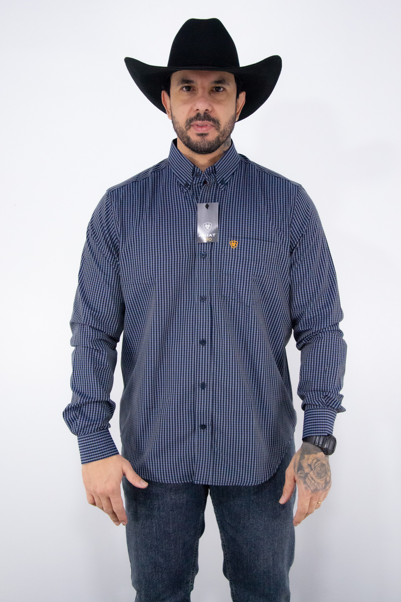 No fechamento, conta com botões personalizados, que trazem um diferencial sofisticado ao design. Além disso, a peça apresenta bordados exclusivos no bolso e na pala, agregando estilo, autenticidade e reforçando a identidade da marca Ariat.