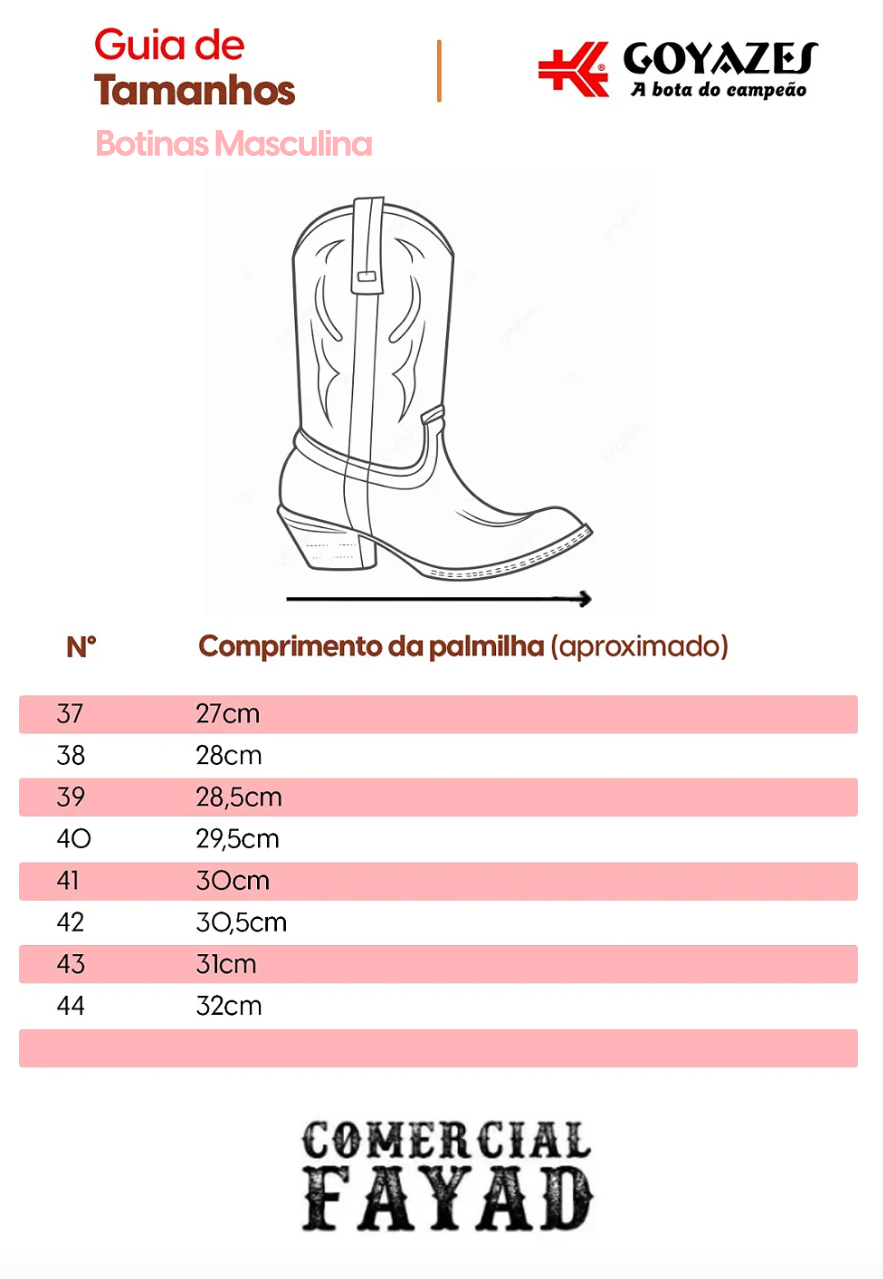 A MARCA GOYAZES A botina Masculina Goyazes é uma opção popular para quem busca um estilo de bota com um toque mais regional e tradicional brasileiro, especialmente inspirado pelo estilo sertanejo e country. A marca Goyazes é conhecida por suas botas de alta qualidade, feitas com couro e com um design que combina conforto e estilo. Descubra o estilo autêntico e a qualidade incomparável da Bota Goyazes Masculina, um verdadeiro símbolo de tradição e conforto.